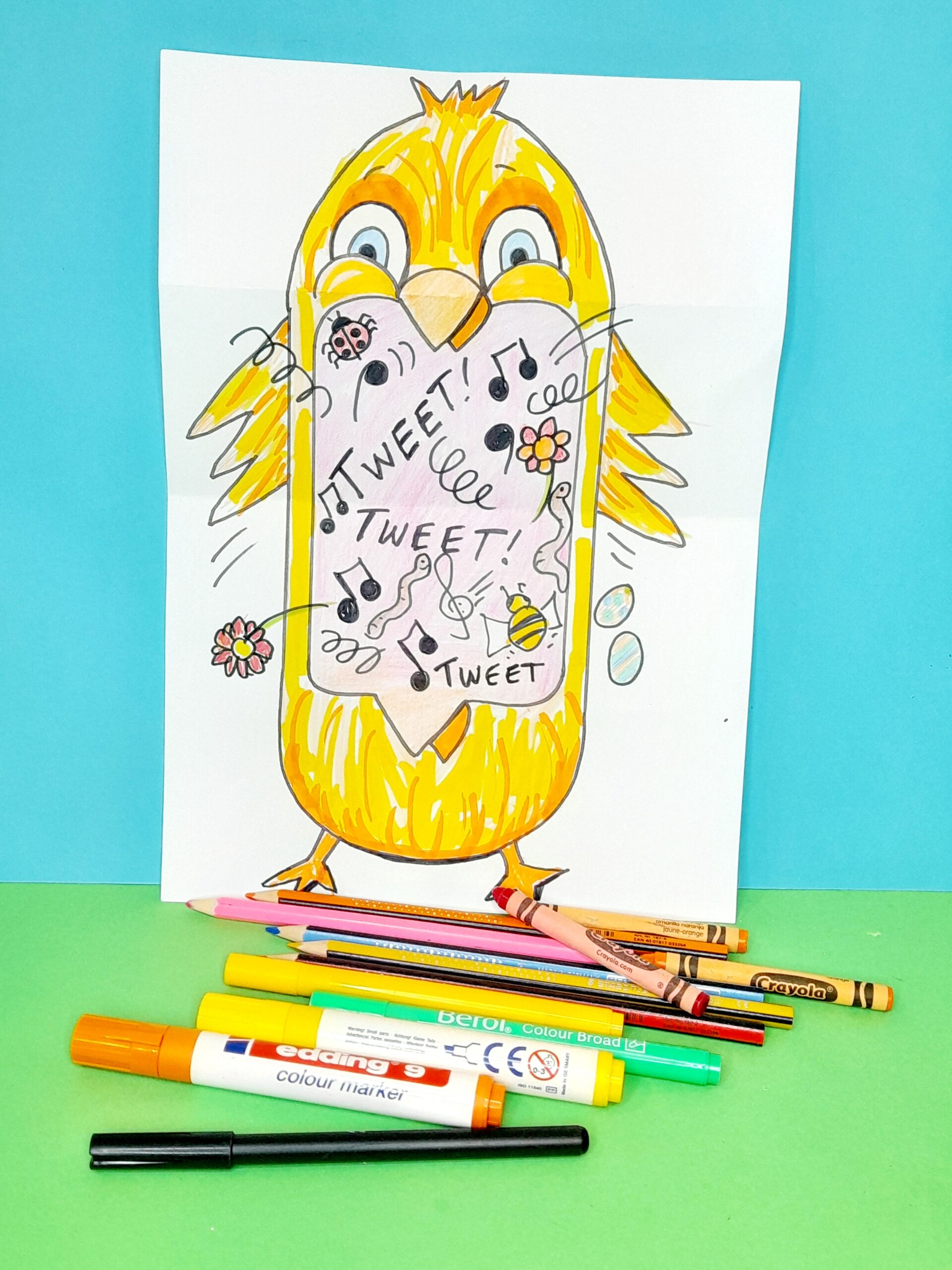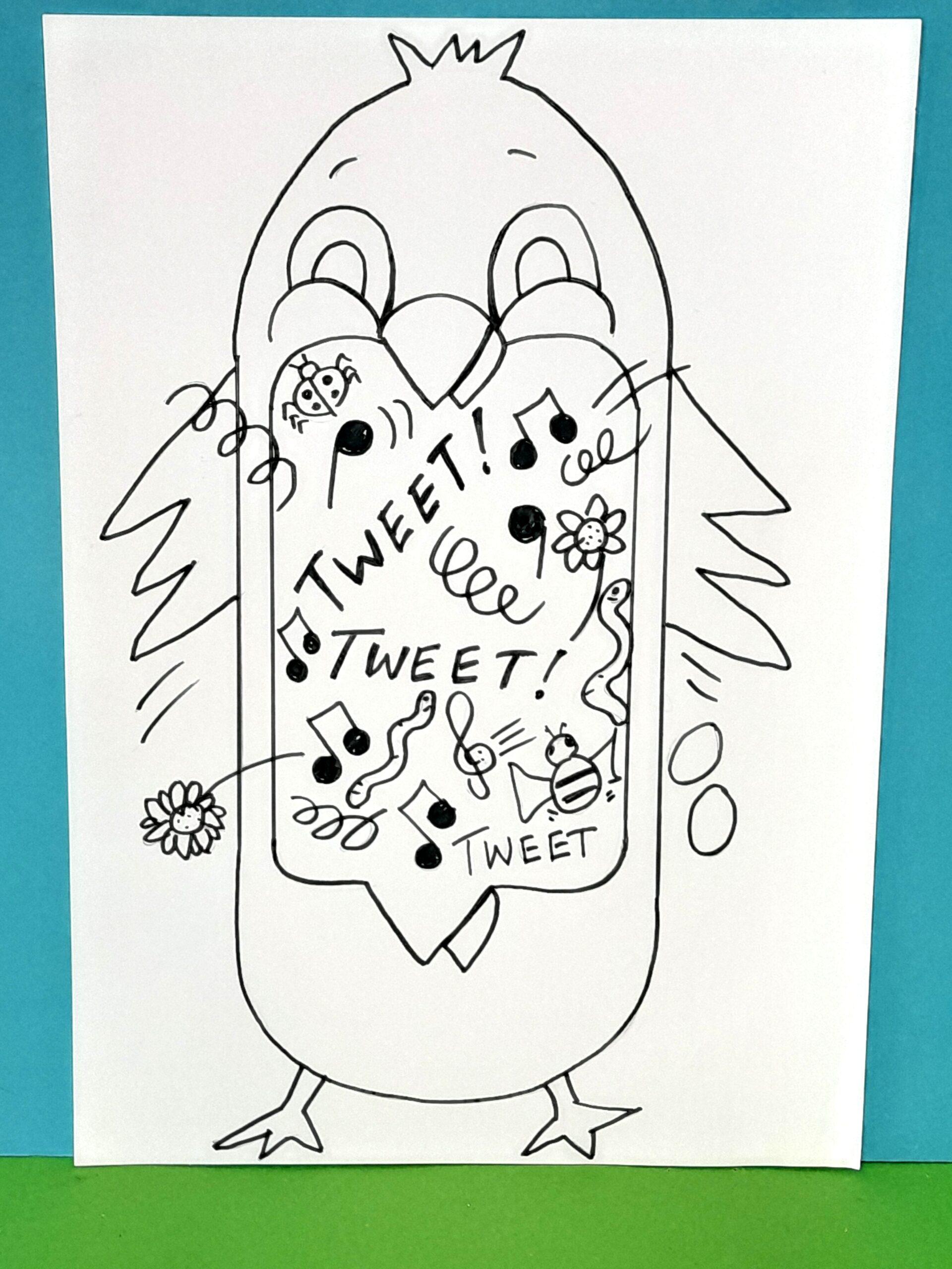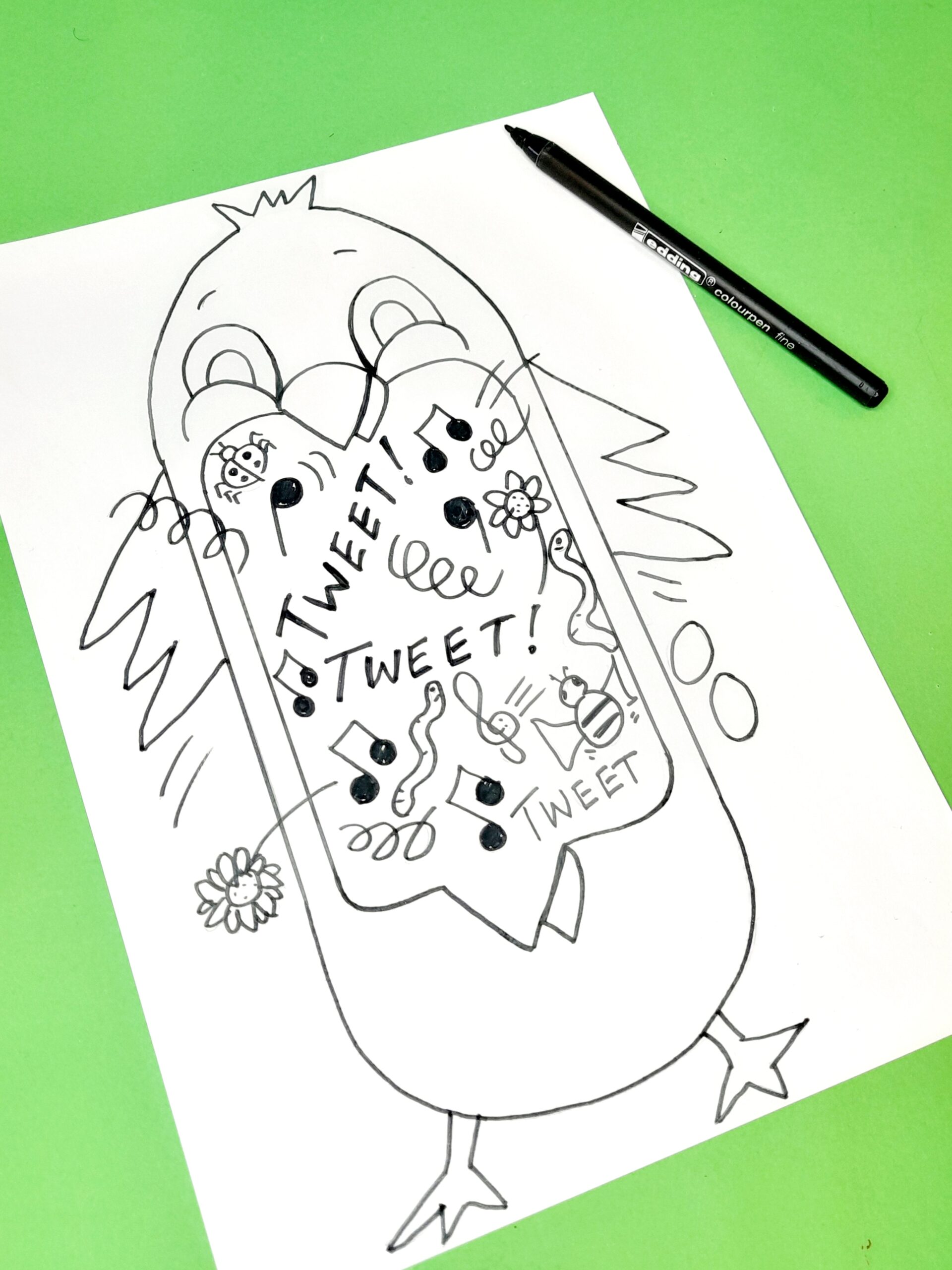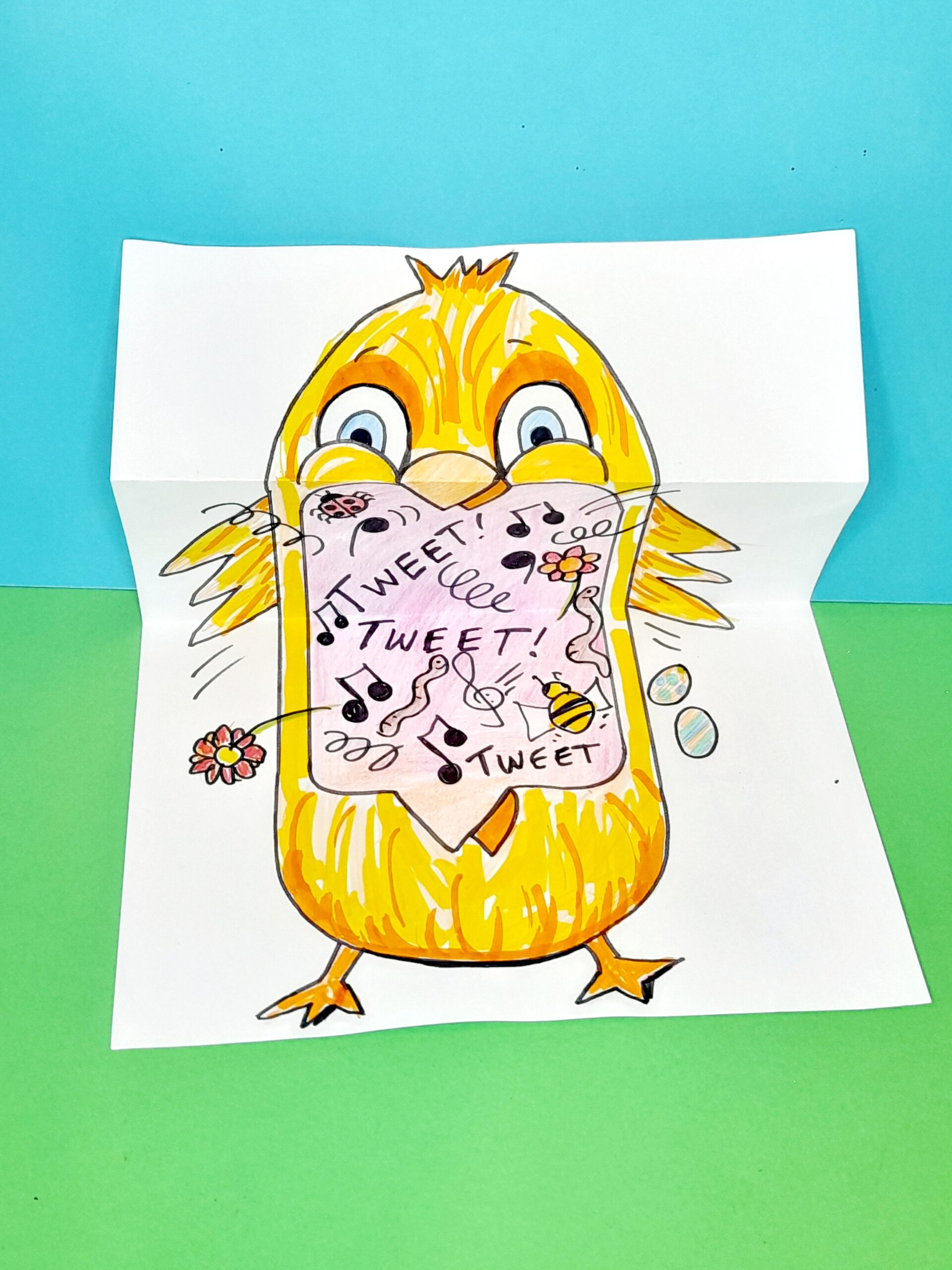 - Draw with your pencil parts popping out of the chick’s mouth, making it fun, explosive, and with a wow factor, then go over everything with a black felt-tip pen, and rub out pencil lines.