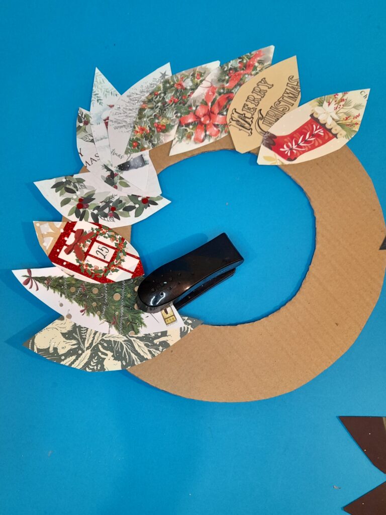 Cut out leaf shapes from your cards, these will be stapled on to create the floral section, then when you overlap more leaves the wreath will take shape and look quite effective!