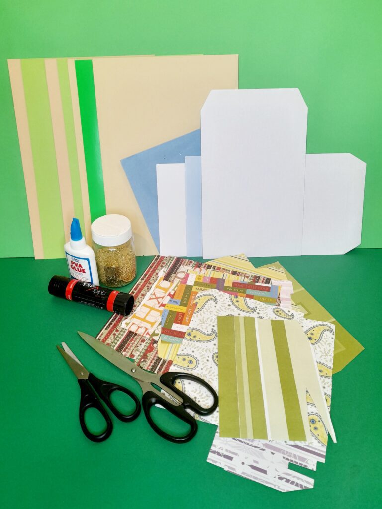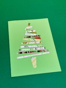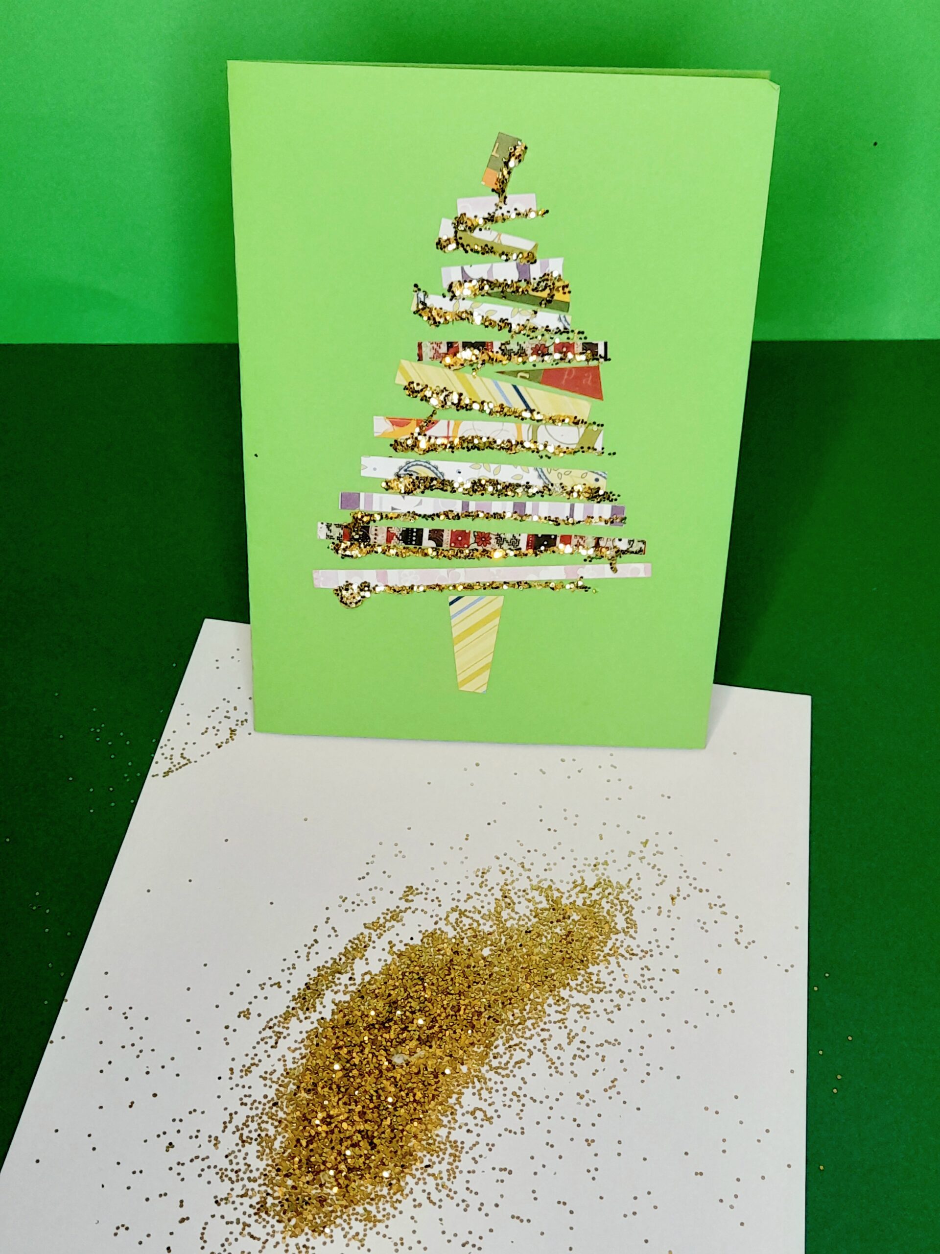 Not only will you be recycling odd scraps of paper, but you will be crafting cards that are simple, yet effective with added glitter, giving the Christmas tree some bling!