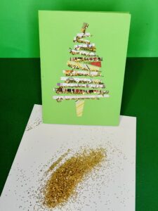 - When sprinkling the glitter, over the fir tree place a sheet of paper under the card to catch it.