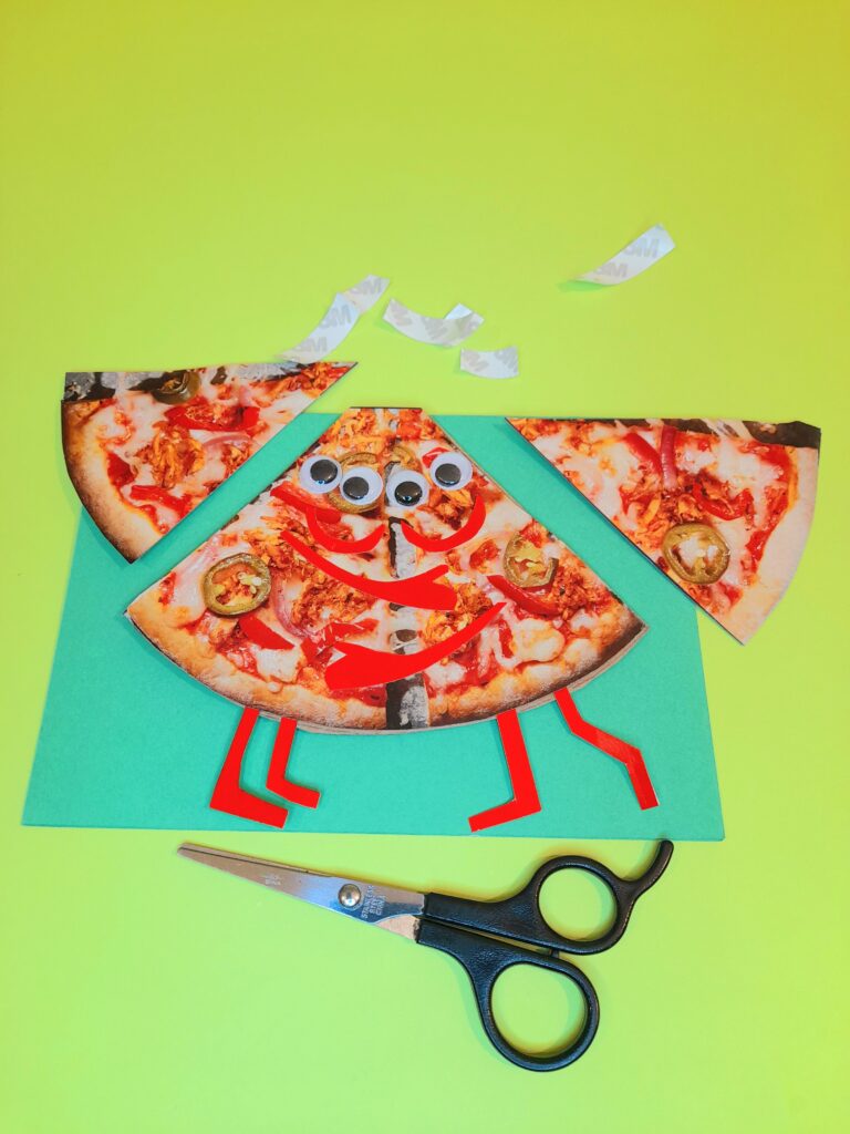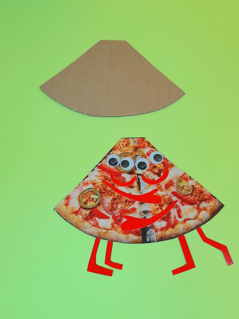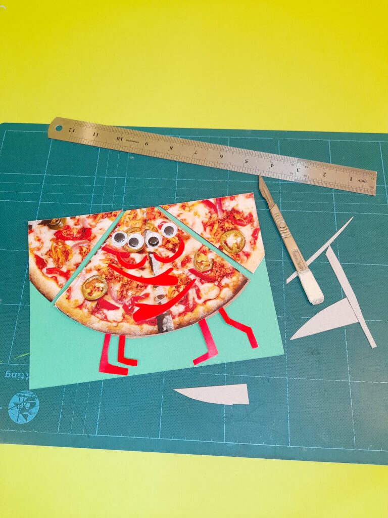 - To make an image 3D cut out the same shape of an image (as shown with the pizza card), and a thicker brown packaging card to elevate the image, thus making it stand out more from the image behind it.