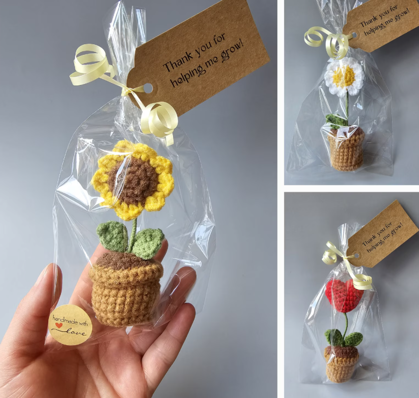 These delightful crochet flowers in a pot, with “Thank you for helping me grow tag!”