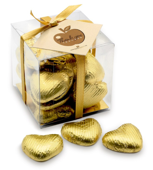 Here’s an affordable ‘Thank you, Teacher’ Gold Chocolate Heart Gift Cube. It contains 20 individually gold-wrapped quality Belgian chocolates, made using cocoa butter and real vanilla!