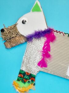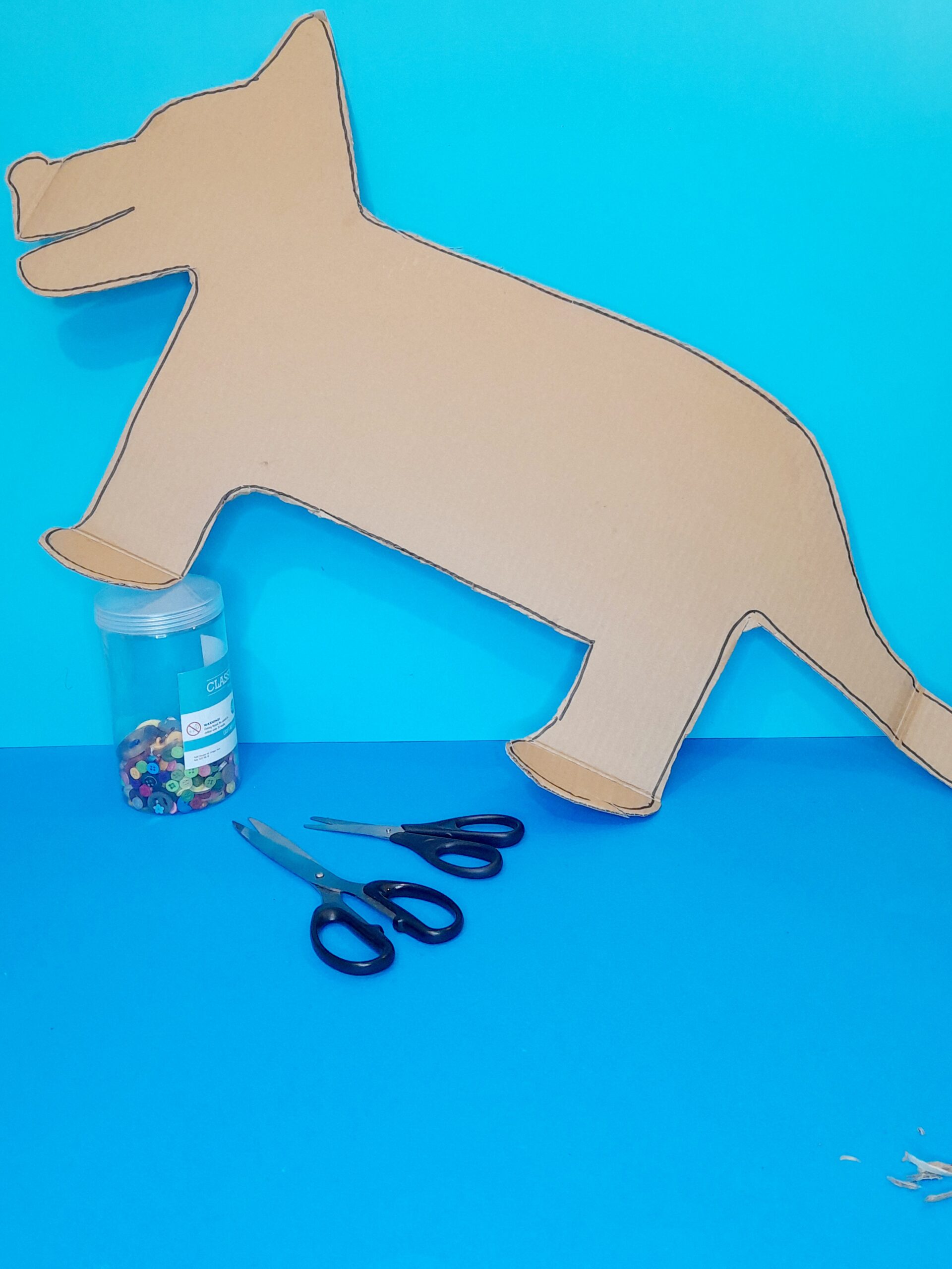 - Decide what you want the image to be. I decided on a dog shape, and drew it on a large packaging card and allowing for a large area so that you can stick a variety of different materials within the outline of the dog.