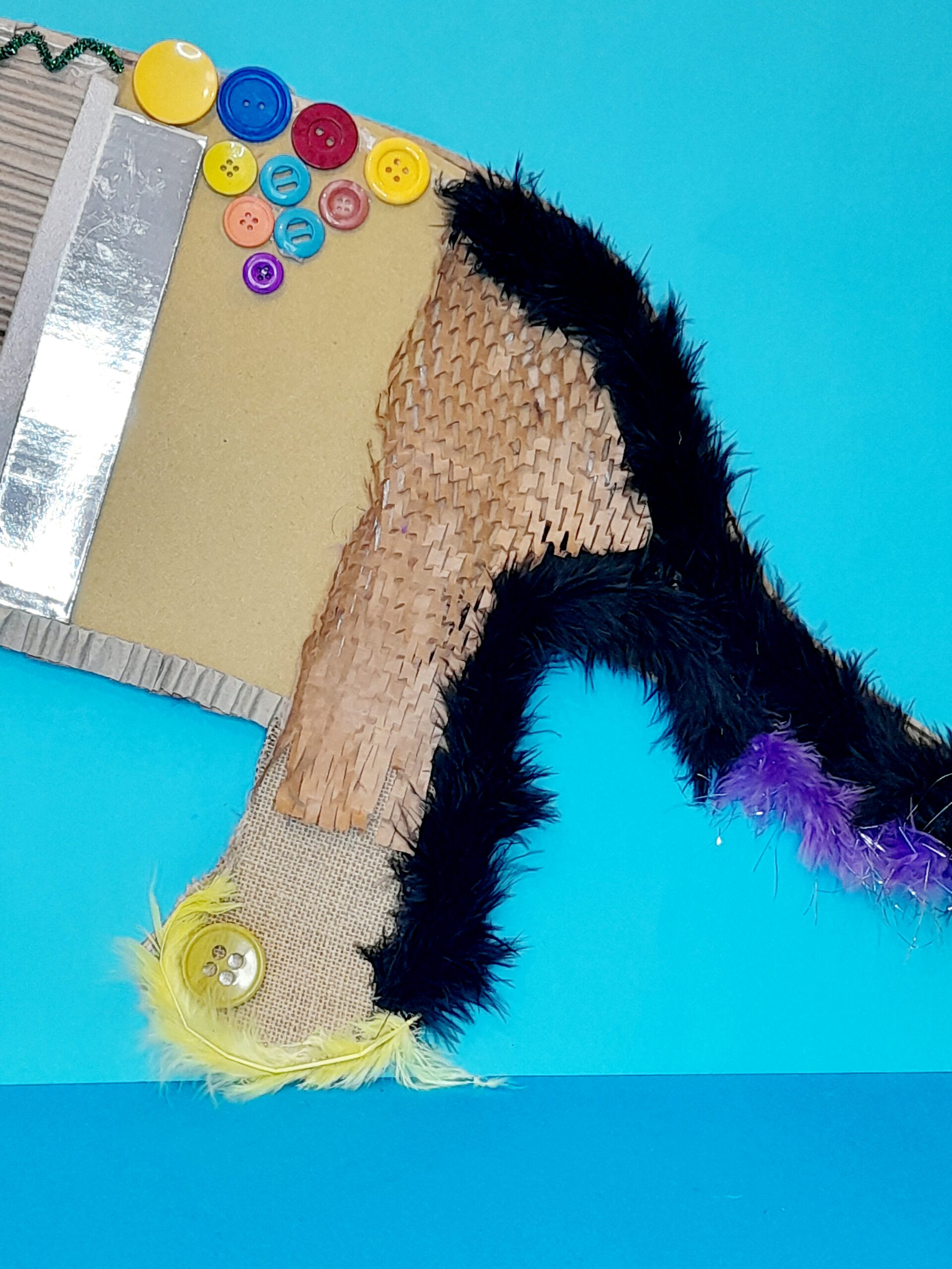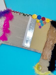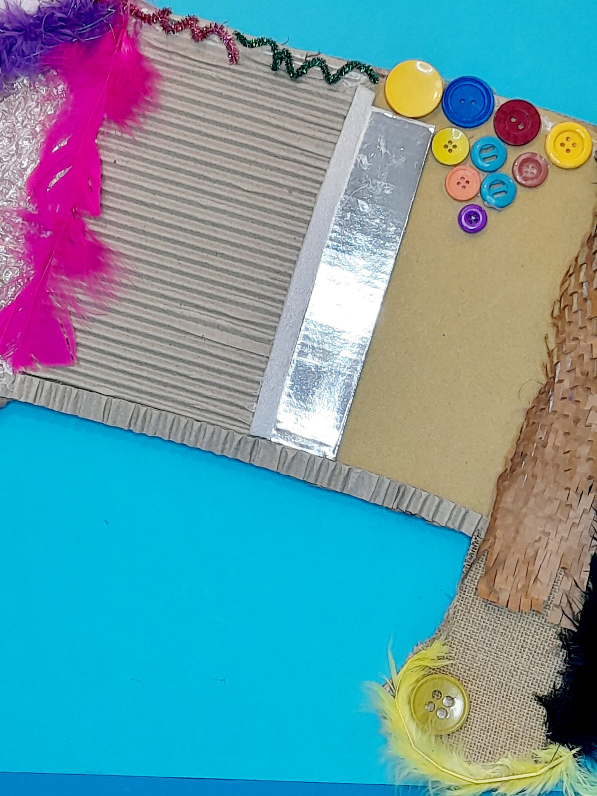 An array of different resources, eg, bubble wrap, sand paper, foil mirror, coloured wrapping, corrugated card, felt fabric. buttons, feathers, glittered pipe cleaners and anything with a different texture.