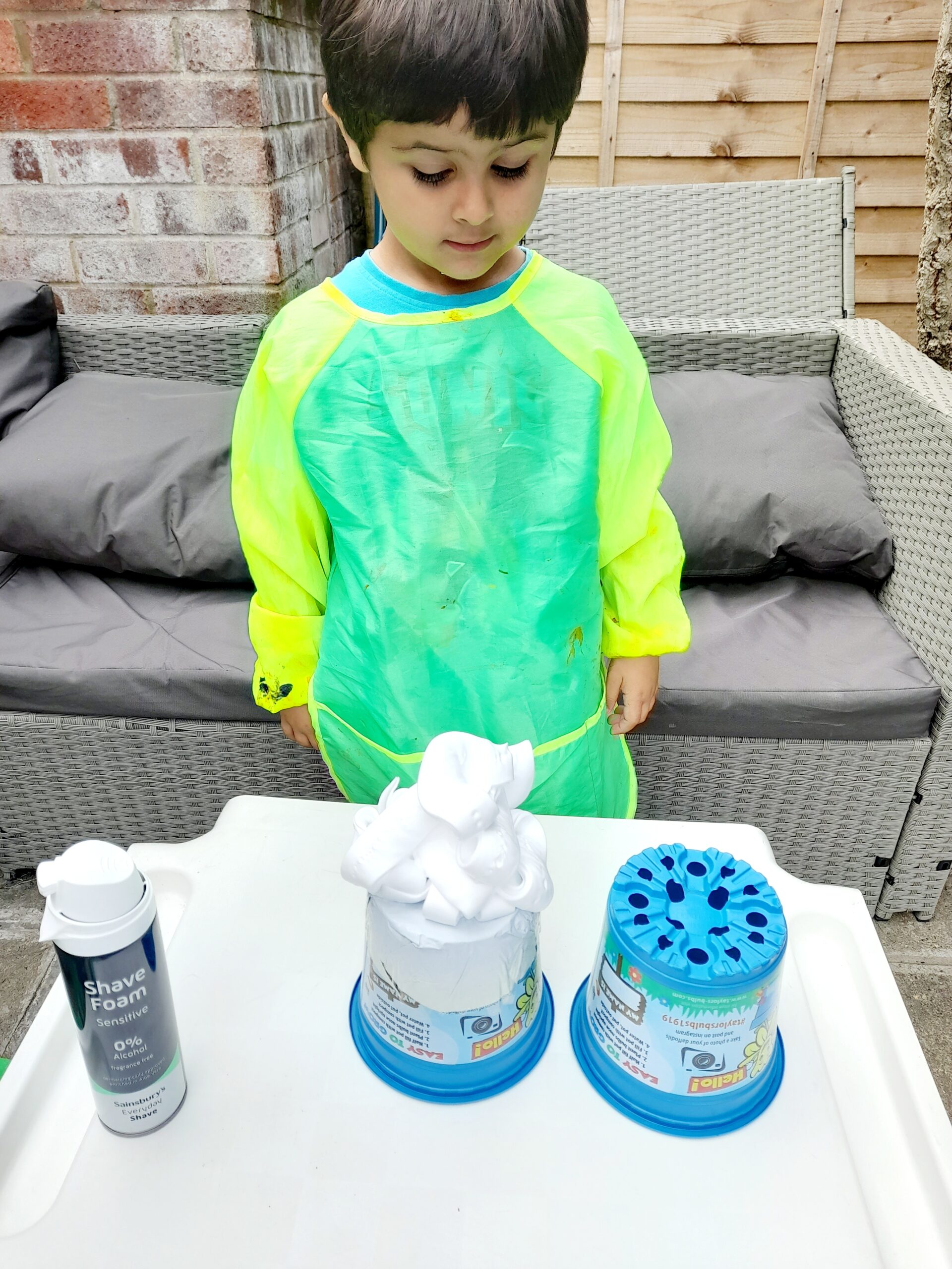 - Getting down to having a bit of outside fun, that’s a messy but has that Wow factor! Creating foamy worms out of shaving foam and 2 ordinary plastic flower pots!