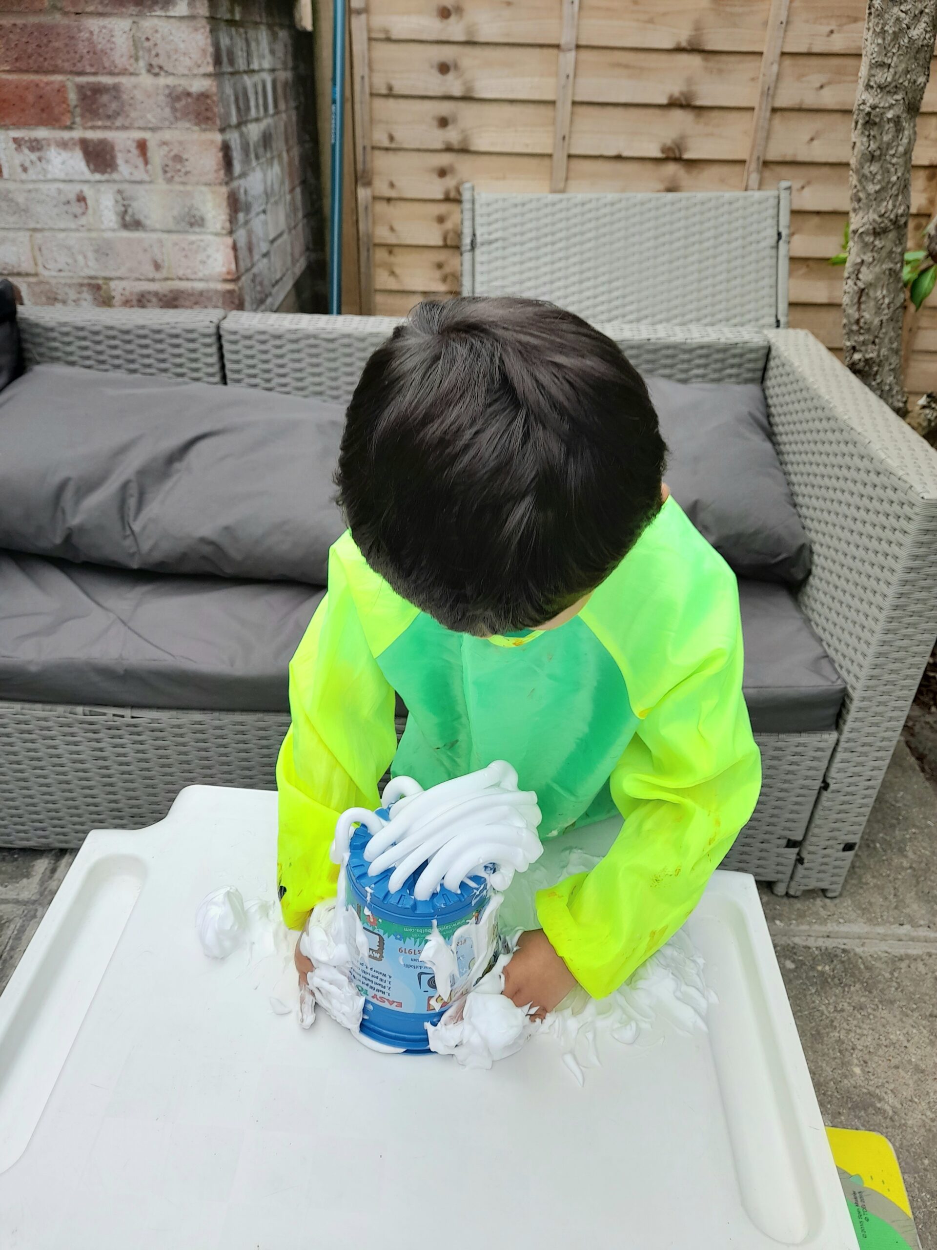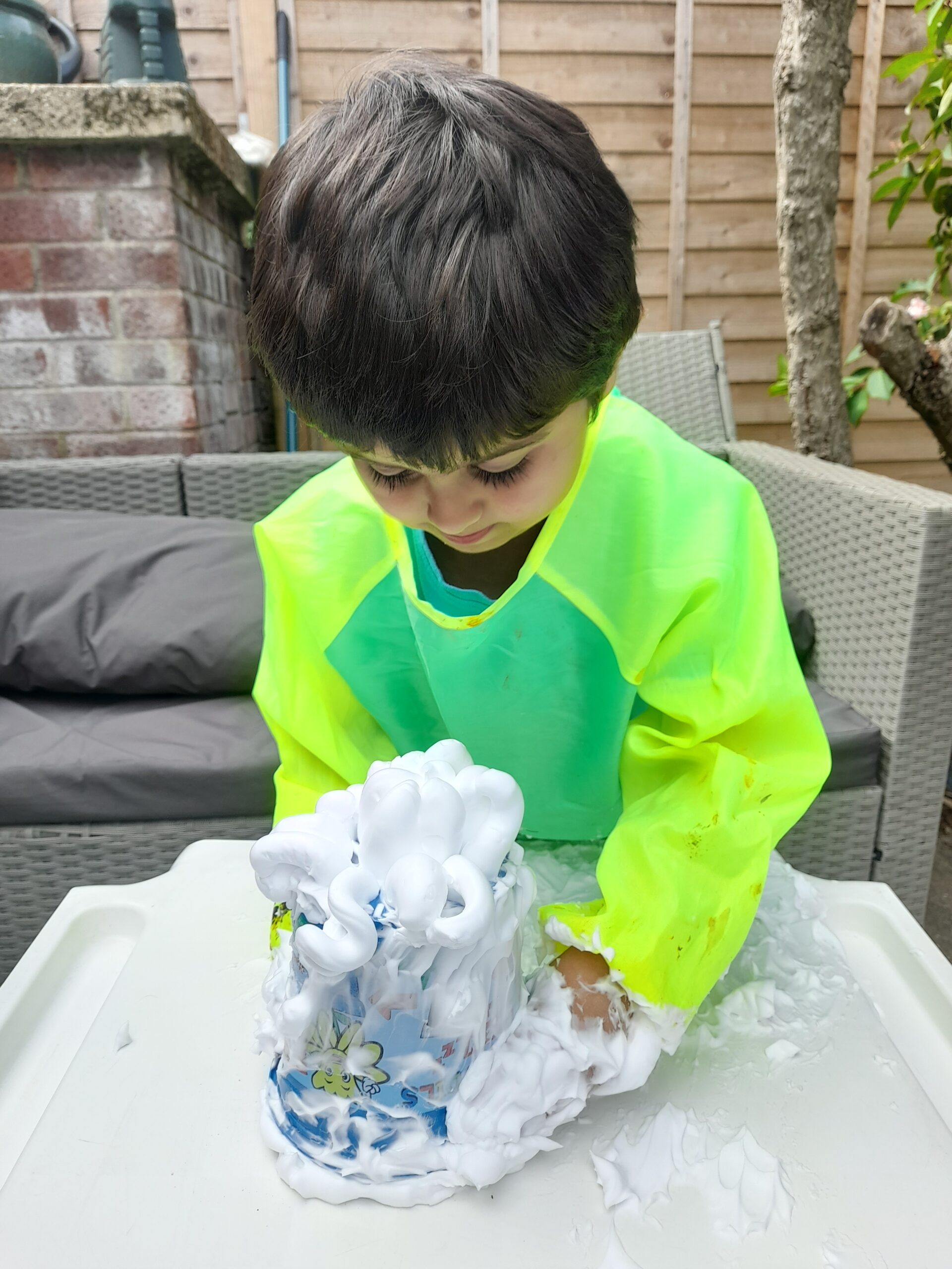 - For the foamy worms, I recommend setting a tray or table outside, as it can get very messy. It’s useful to have a kids’ apron, or an old t/shirt to hand, especially if your kids start to clap their hands and get overexcited!